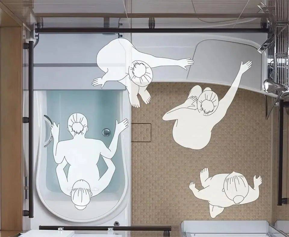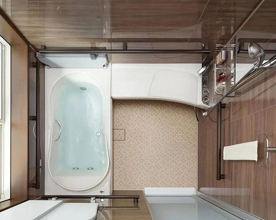 大多卫生间,跟国内高铁动车卫生间地面差不多,若是临近洗漱区有落地窗,浴缸一侧会妥帖安设花洒,根基动线如下: